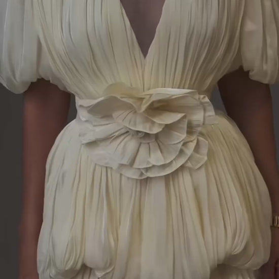 ‘the ÉLISE dress’ a mini dress made from lightweight pleated fabric, featuring puffed sleeves and a bold flower detail at the waist. The soft cream color and airy draping give it a delicate, feminine look 🤍
