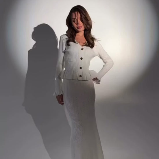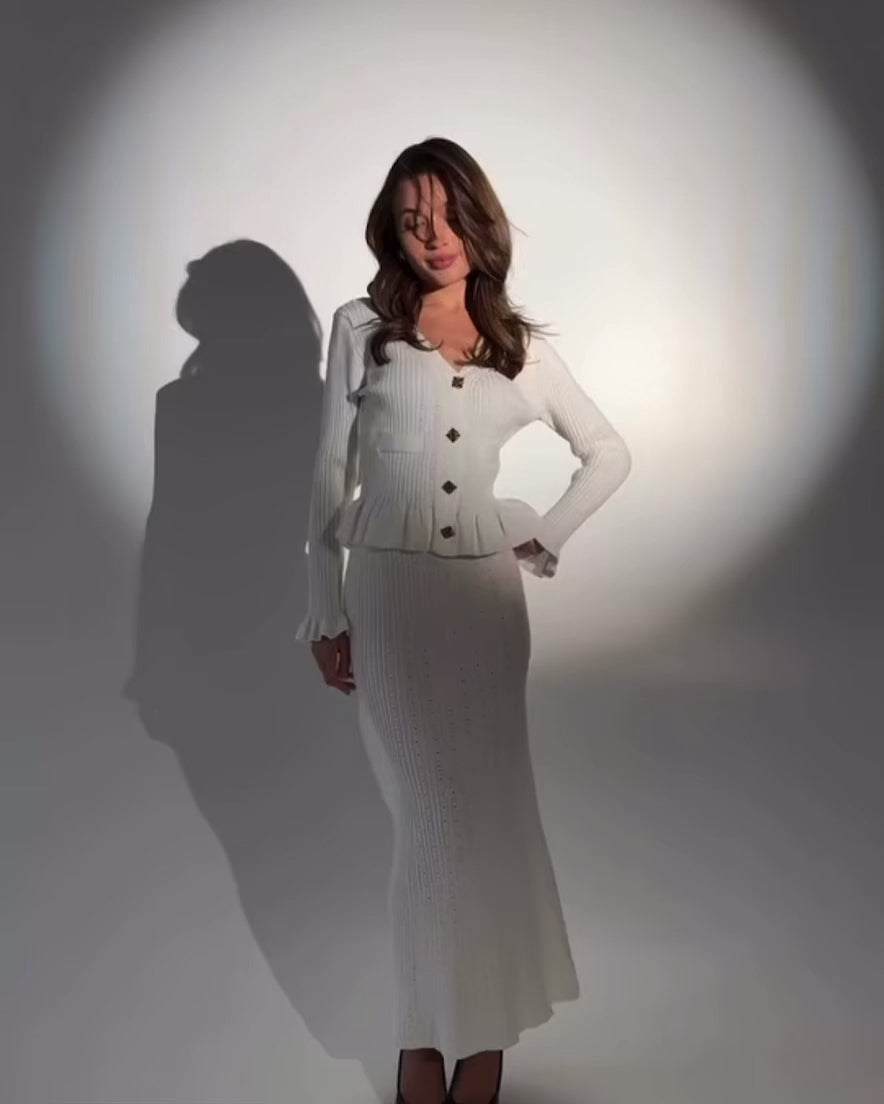 ‘the PEARL set’ a figure-flattering knitted set made from soft ribbed fabric. Includes a white cardigan with elegant button closure and a feminine cut, paired with a matching maxi skirt. Cozy, stylish, and versatile for any occasion 🤍